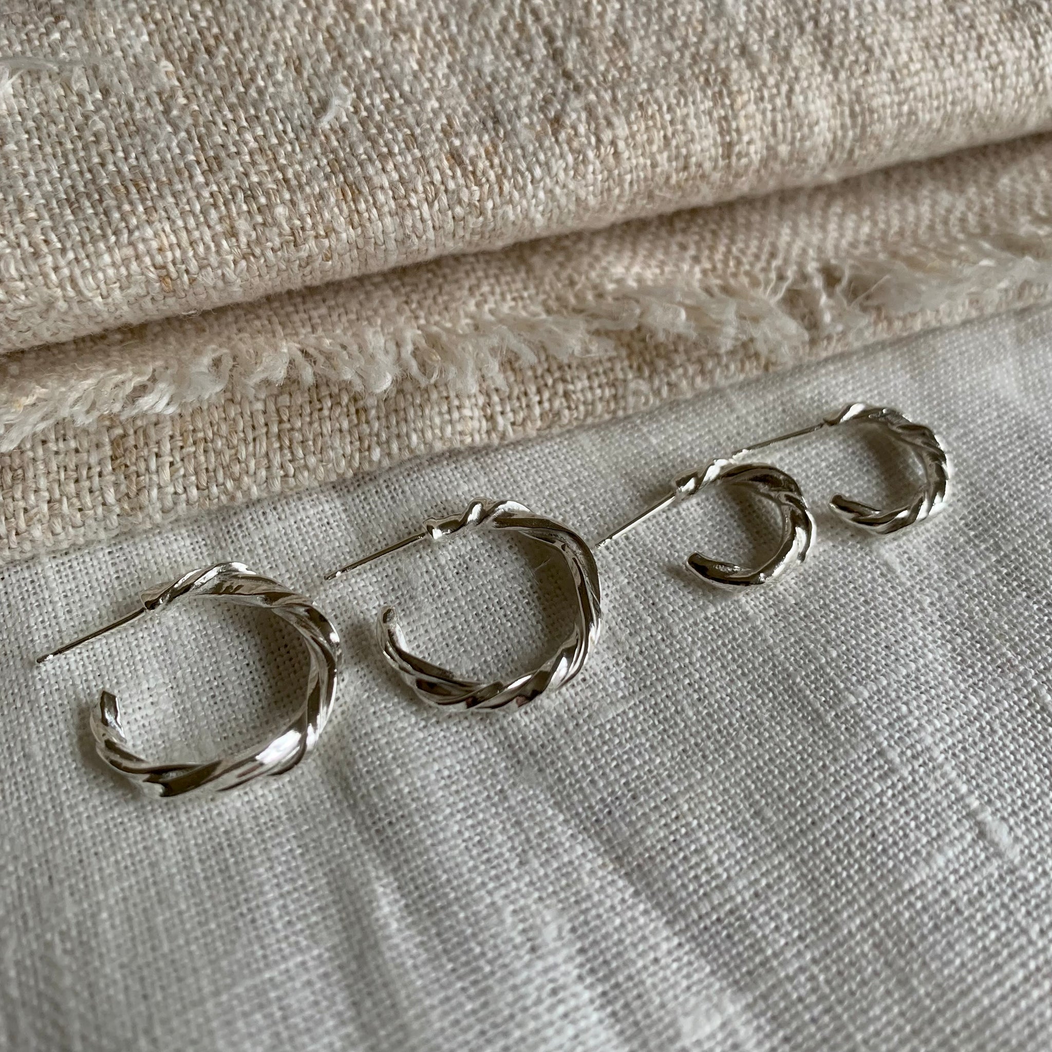 Medium thickness open hoop earrings in two sizes. Irregular sculptural profile, with an organic ribbon twist pattern. Handmade in solid recycled sterling silver in a choice of two sizes with sterling silver posts and butterfly backs too. Gift boxed.