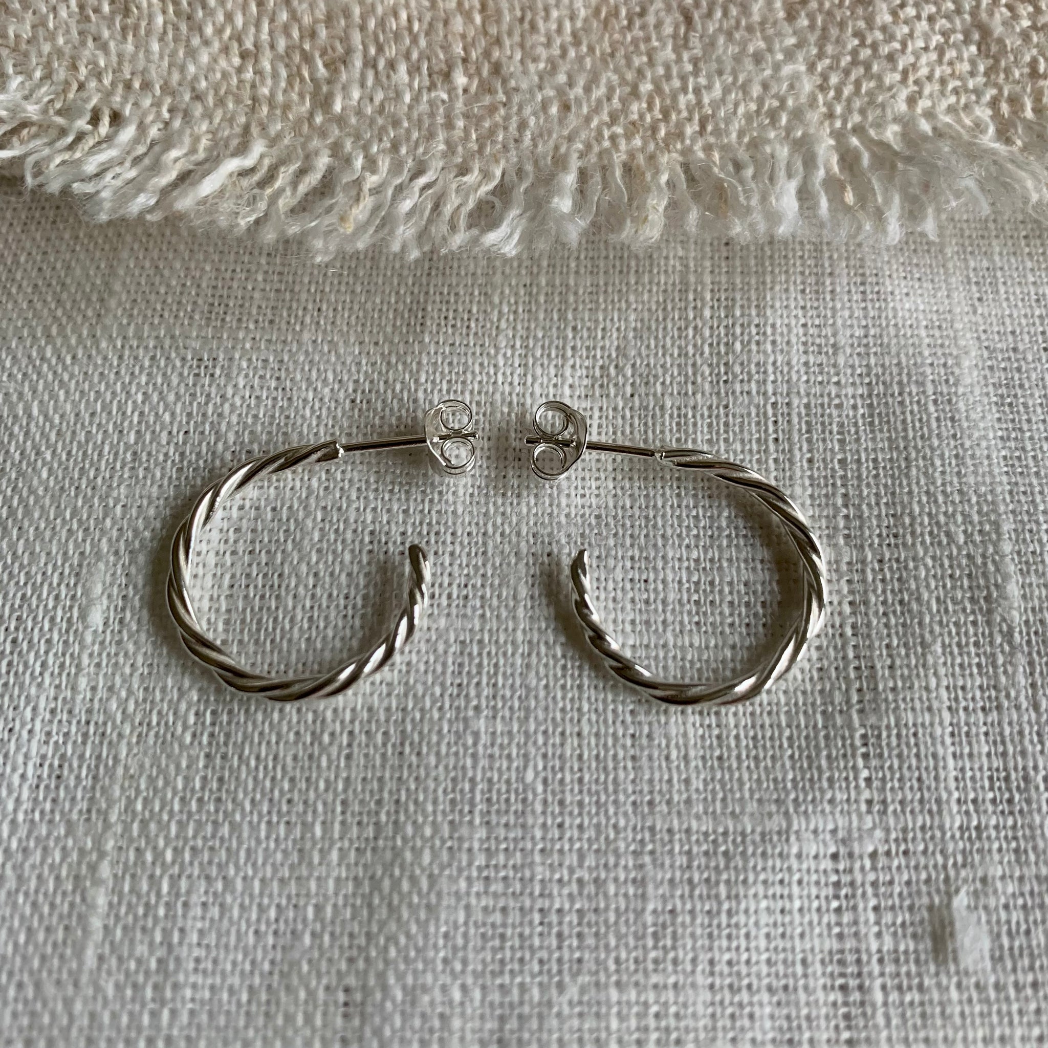Thin small to medium twisted open C shaped silver hoop earrings with a round profile. Hand formed in solid polished recycled silver wire with sterling silver posts and butterfly backs.