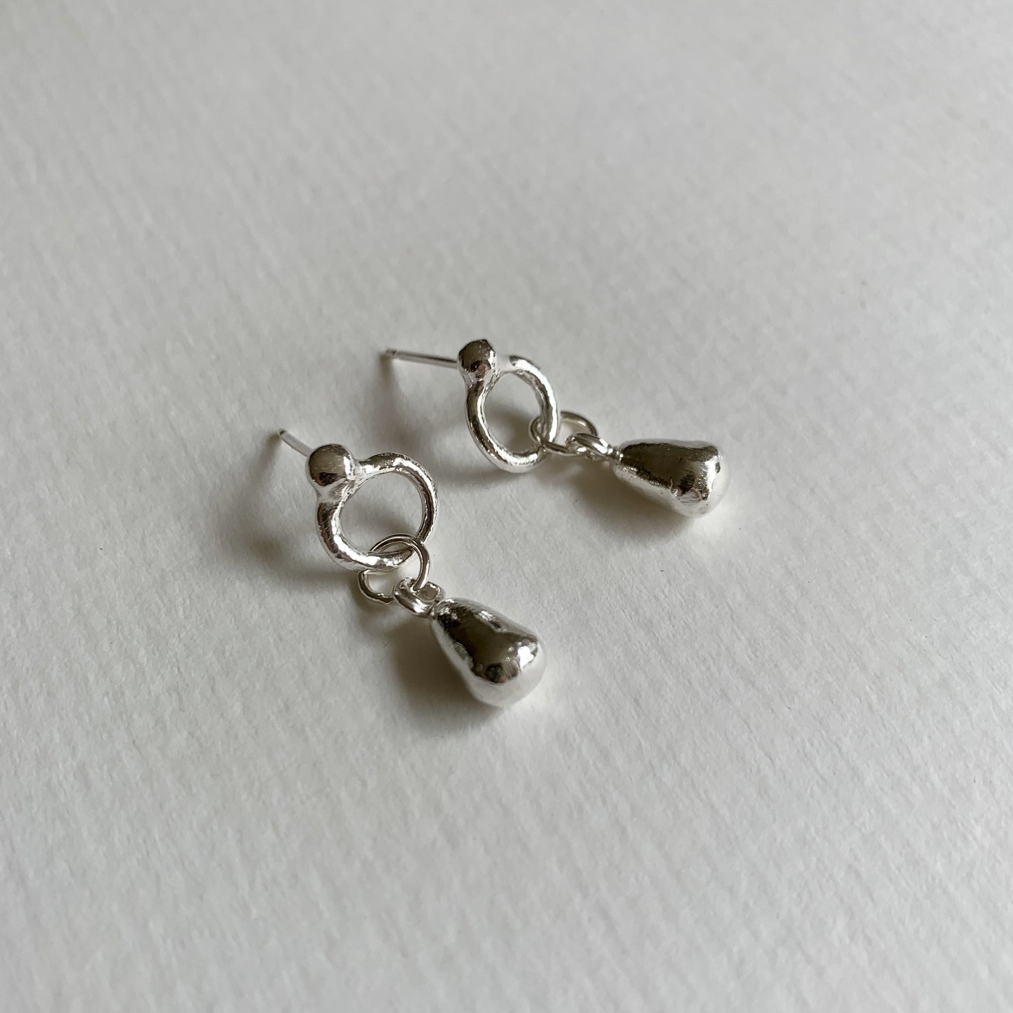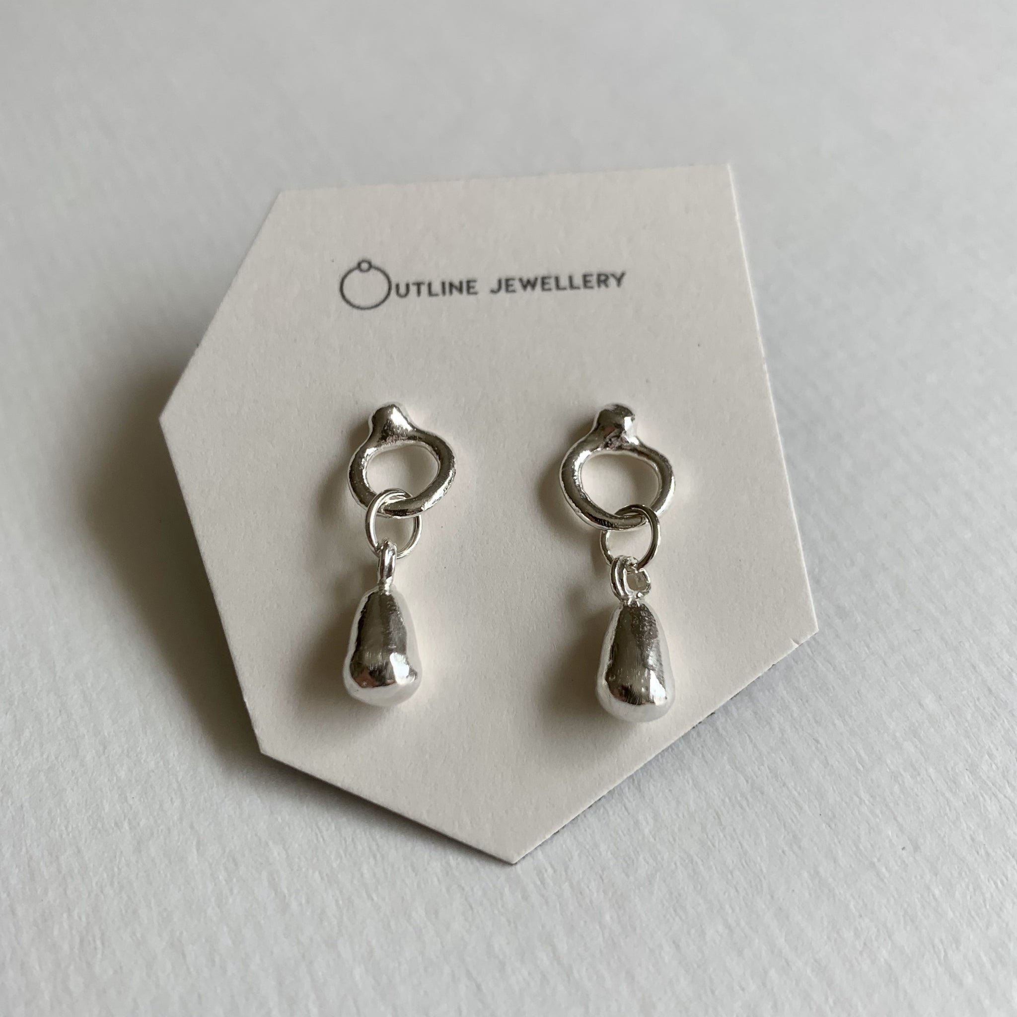 These shorter length dangle drop earrings feature a unique handcrafted molten texture that gives them a beautifully organic, fluid appearance. The design combines a softly rounded silver circle with a delicate droplet, creating movement as you wear them.