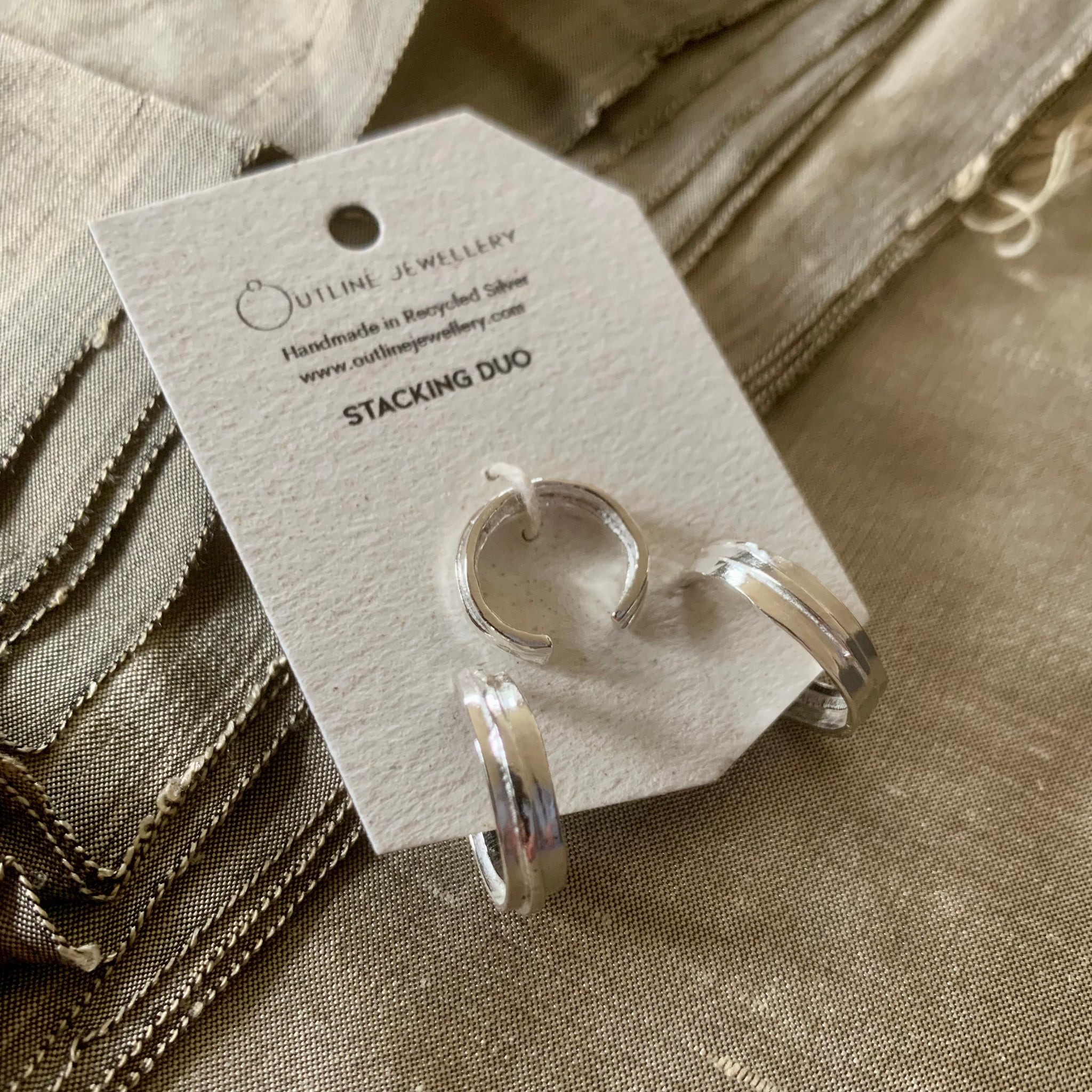Small ridged texture irregular shaped hoop earrings with a flat ribbon style profile and matching mid ear cuff. Reminiscent of the organic shapes found in seashells. Handmade in solid polished recycled silver with sterling silver posts and butterfly backs. Gift boxed.