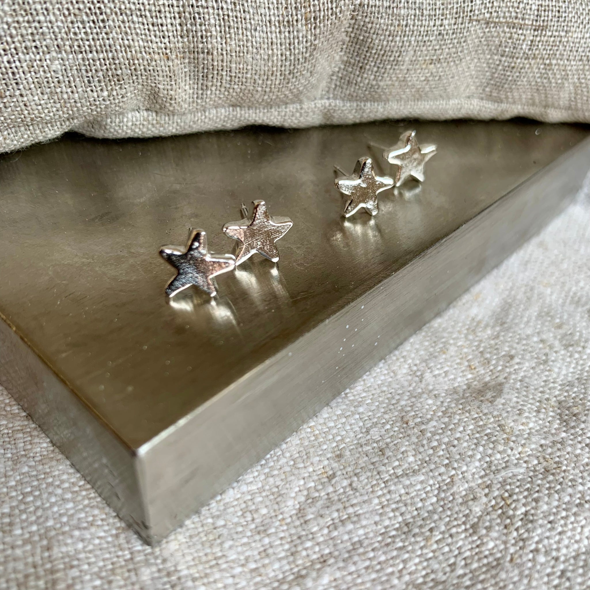 Star shaped small to medium stud earrings individually carved from solid recycled sterling silver nuggets. Rustic style hand drawn star shape with a polished finish. Sterling silver posts and butterfly backs. presented on an earring card and gift boxed.