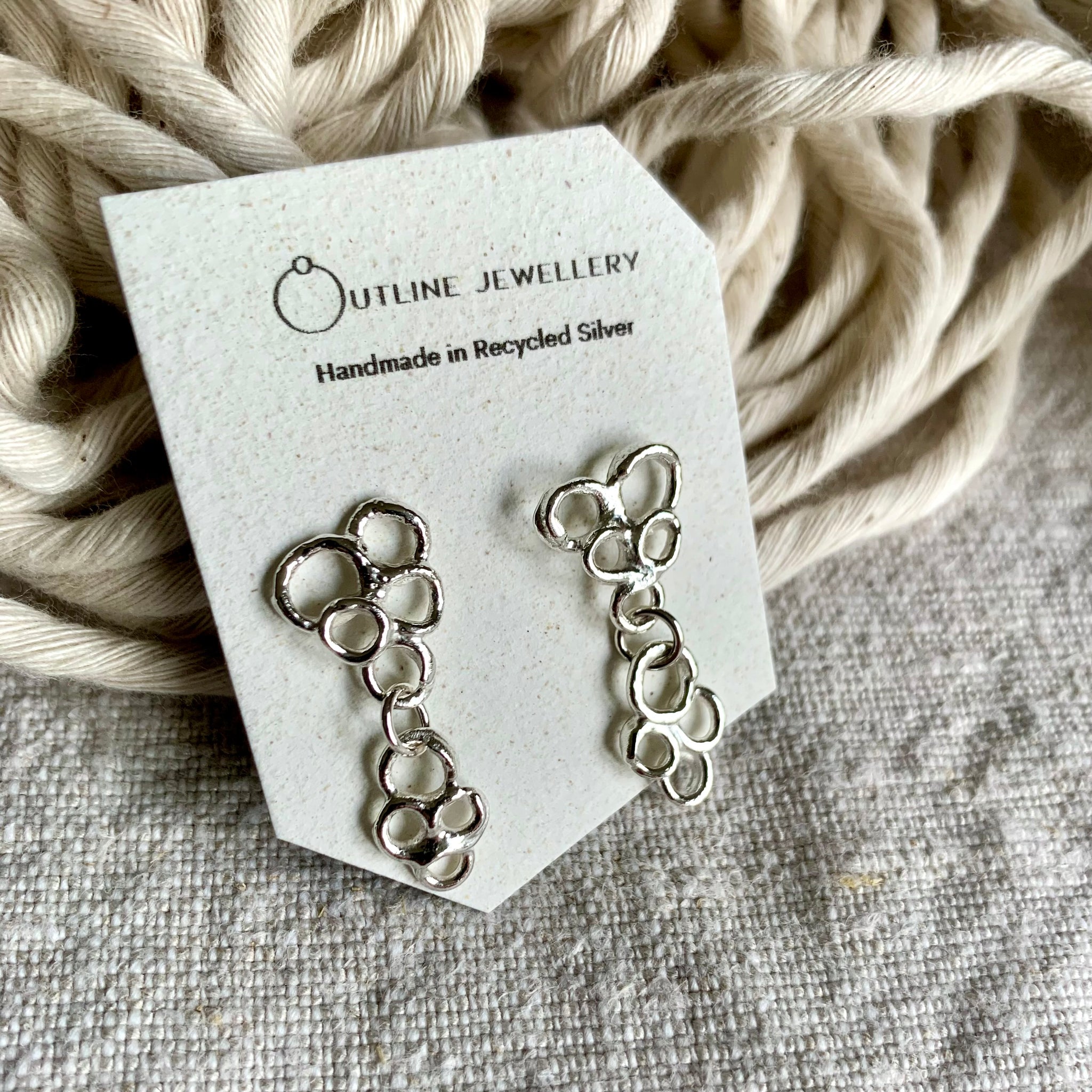 Short dangle drop earrings. Handmade in molten recycled sterling silver with little loops of silver in cluster shapes. Sterling silver posts and butterfly backs. presented on an earring card and gift boxed.