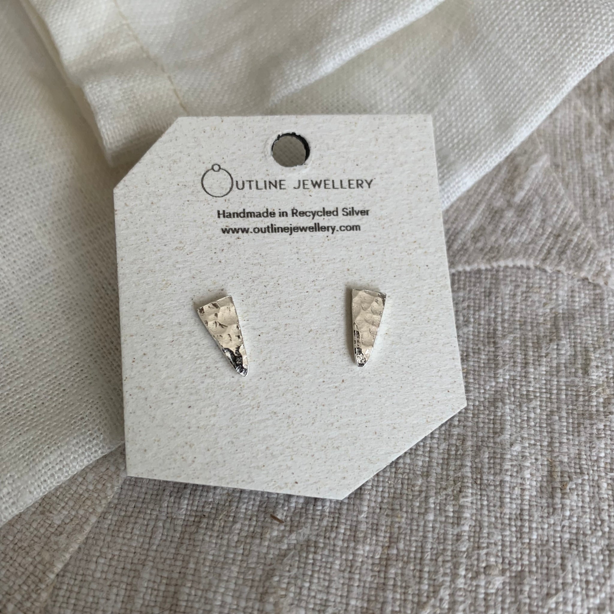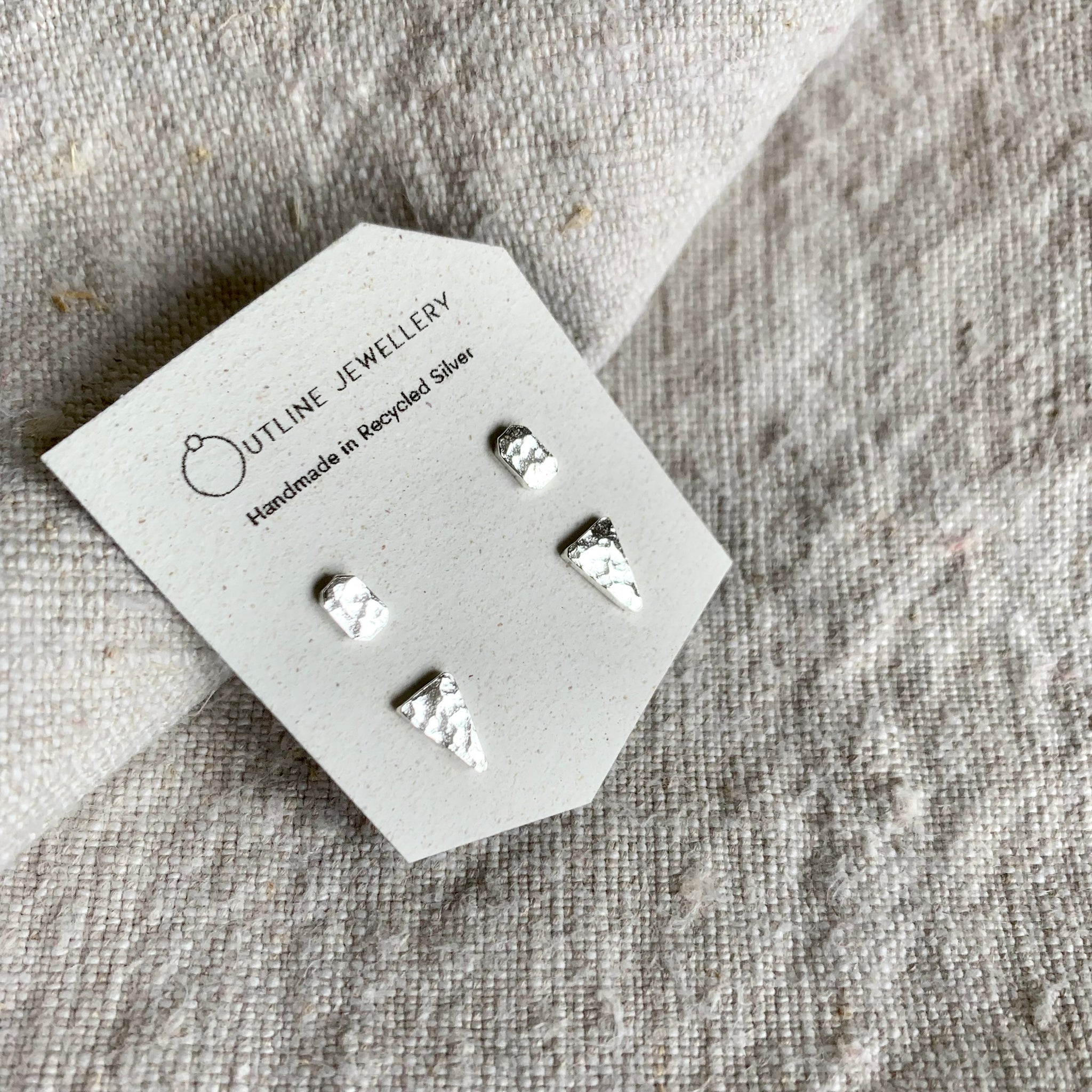Small triangle and oblong shaped stud earrings handmade in sterling silver with a hammered surface texture. Sterling silver posts and butterfly backs. presented on an earring card and gift boxed. Choose from two different pairs or a duo set of both styles.